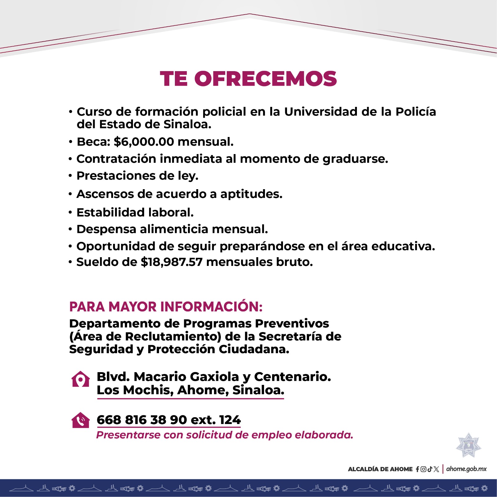 Los Mochis, Sinaloa. – El Ayuntamiento de Ahome y la Secretaría de Seguridad y Protección Ciudadana convocan a jóvenes interesados en servir a su municipio desde las labores propia de la policía municipal a participar en el proceso de reclutamiento de aspirantes con perfil de policía para la Unidad de Prevención.