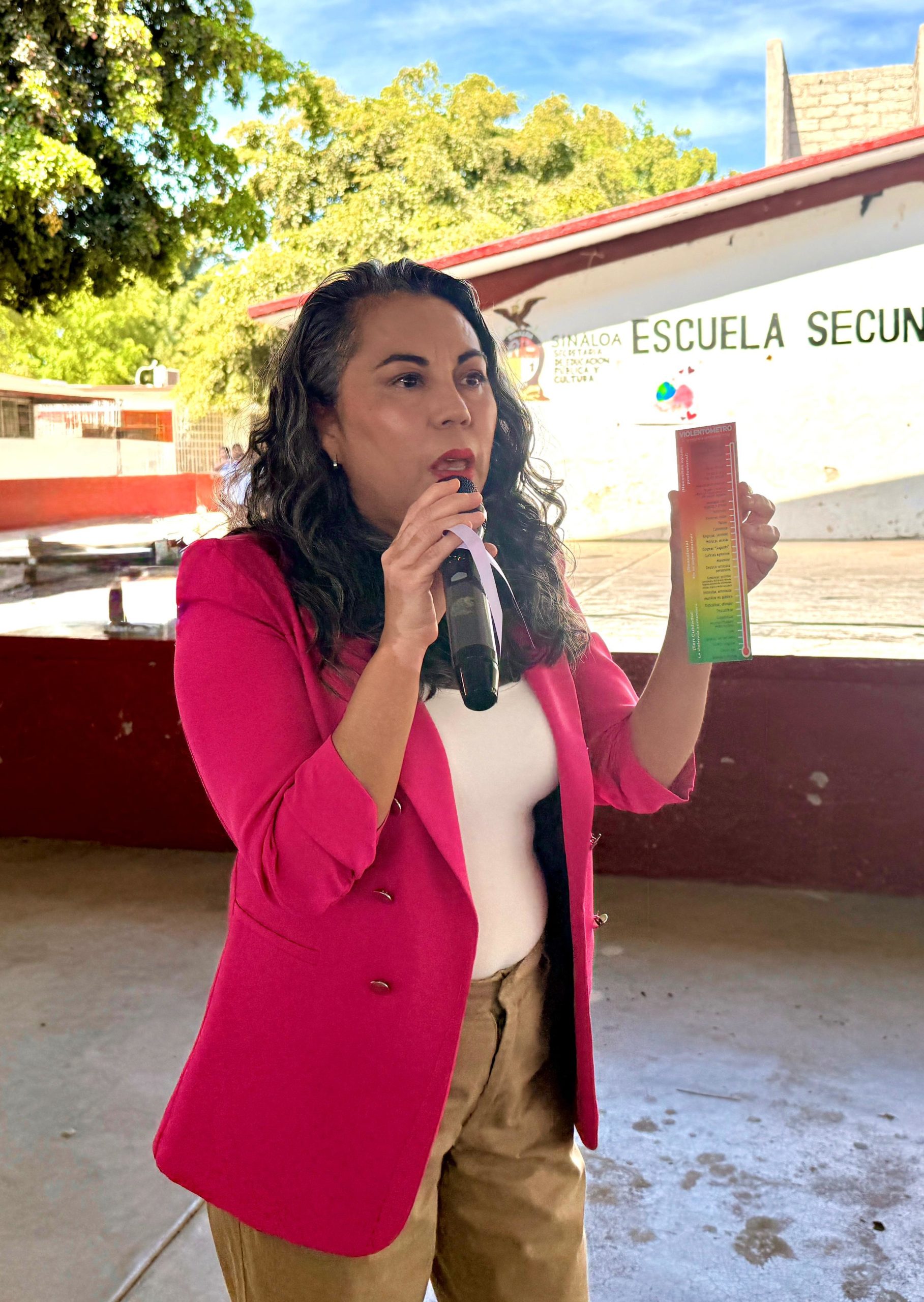 Villa Juárez, Navolato, Sinaloa. – Como parte de las acciones de prevención y sensibilización sobre la violencia contra las mujeres, CEPAVIF llevó a cabo una charla sobre el Violentómetro, así como la instalación de material visual a gran escala sobre esta herramienta para una mejor alcance, en la Escuela Secundaria Técnica No. 51 Villa Benito Juárez, ubicada en la sindicatura de Villa Juárez, municipio de Navolato.